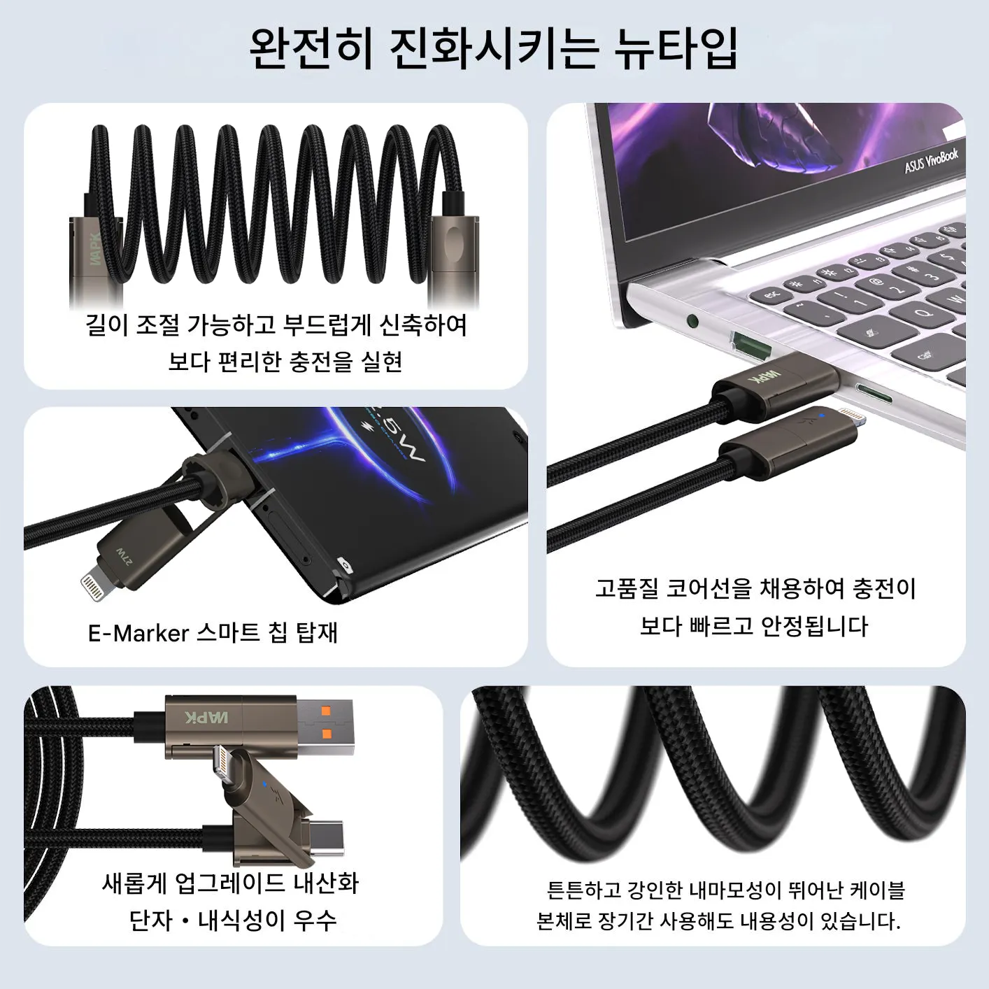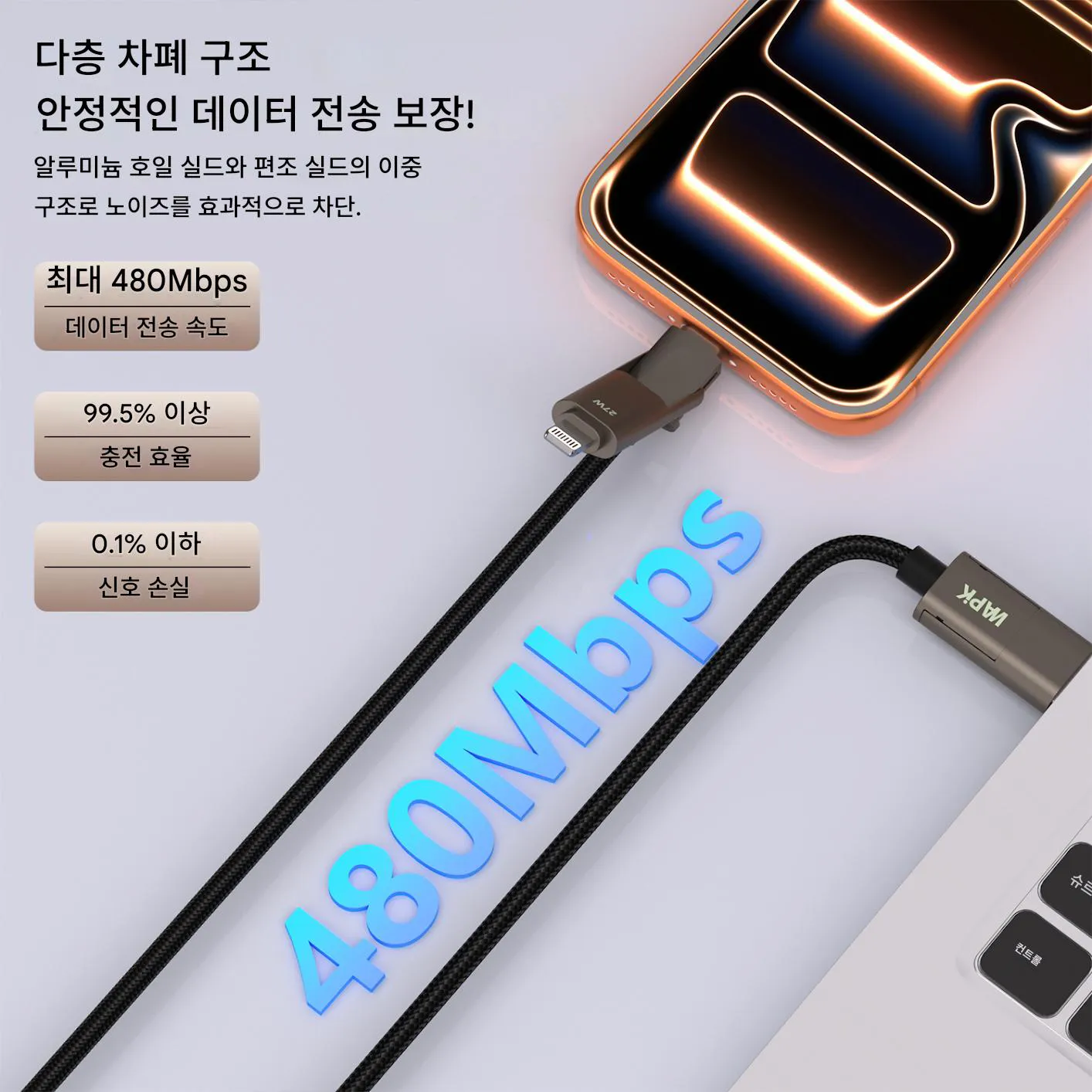 - 다층 차폐 구조 + 고순도 굵은 구리선을 적용해 데이터 전송 안정성(480Mbps)과 충전 효율(99.5%)을 높이고 손실은 최소화함;