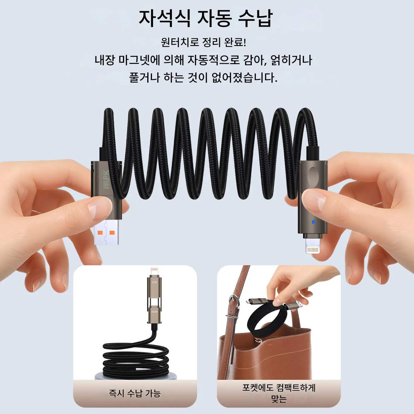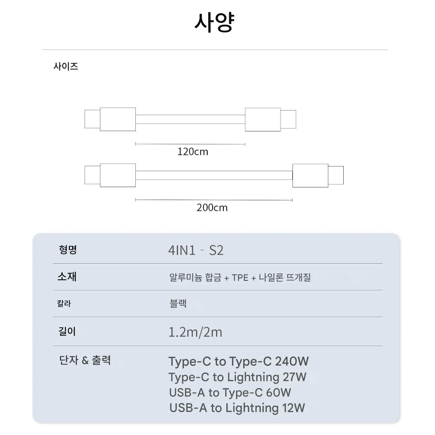 - 고밀도 편조선 + 자석 흡착식 자동 수납으로 내구성이 뛰어나(5만회 구부림·10kg 인장 강도) 일키로 정리도 가능하며, 1.2m/2m 길이를 선택할 수 있어 출장·여행 시 휴대가 매우 편리