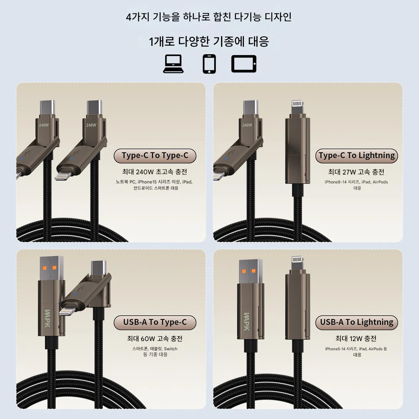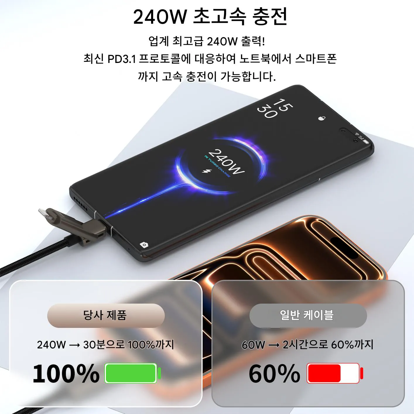 - 240W 초급속 충전(PD3.1 프로토콜)을 지원해 30분 만에 기기를 충전 완료할 수 있으며, 스마트폰·태블릿·노트북 등 다종 기기를 호환합니다. Type-C/USB-A에서 Lightning/Type-C로 4가지 포트를 일키로 전환 가능;