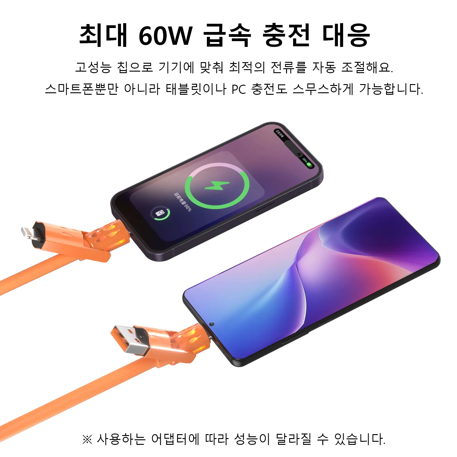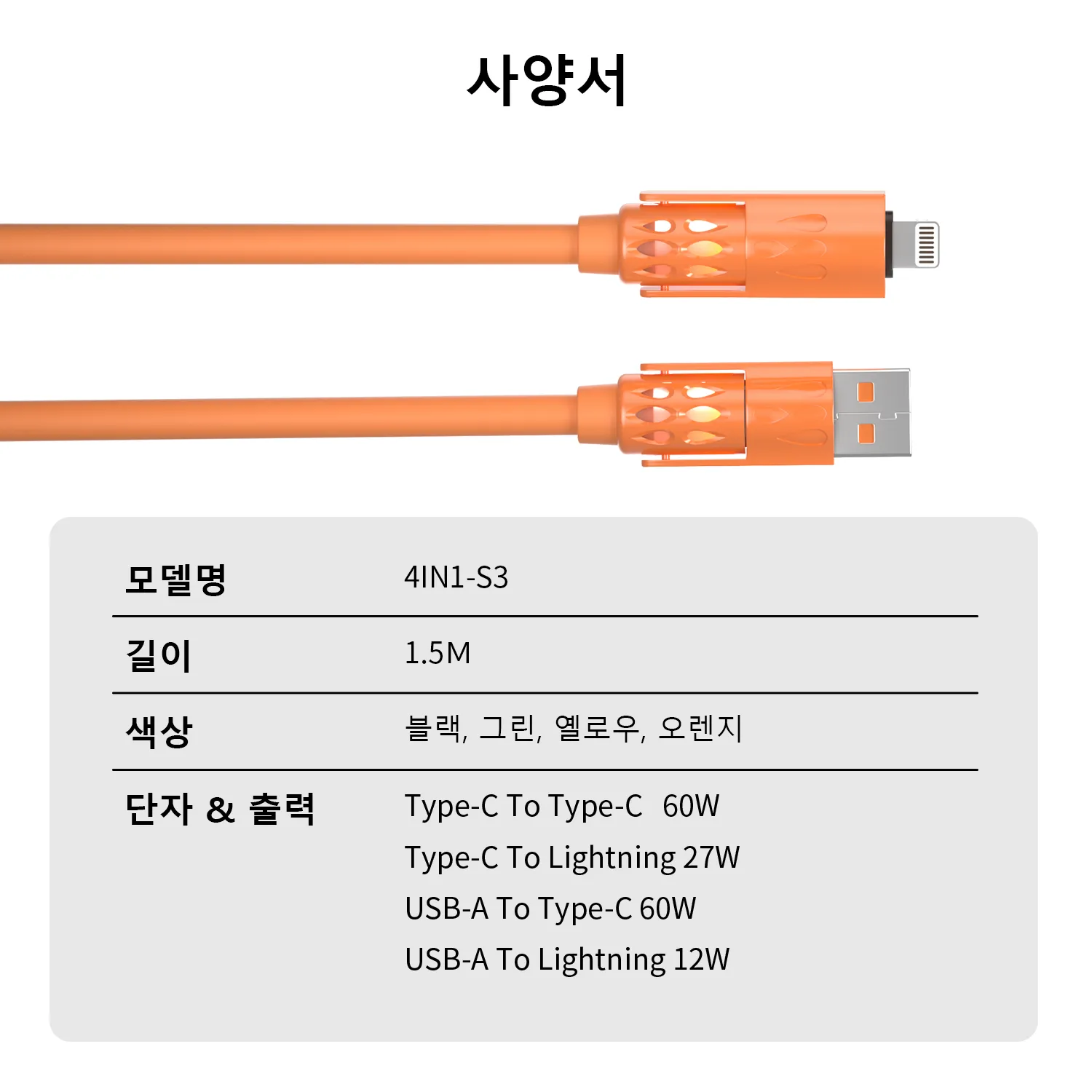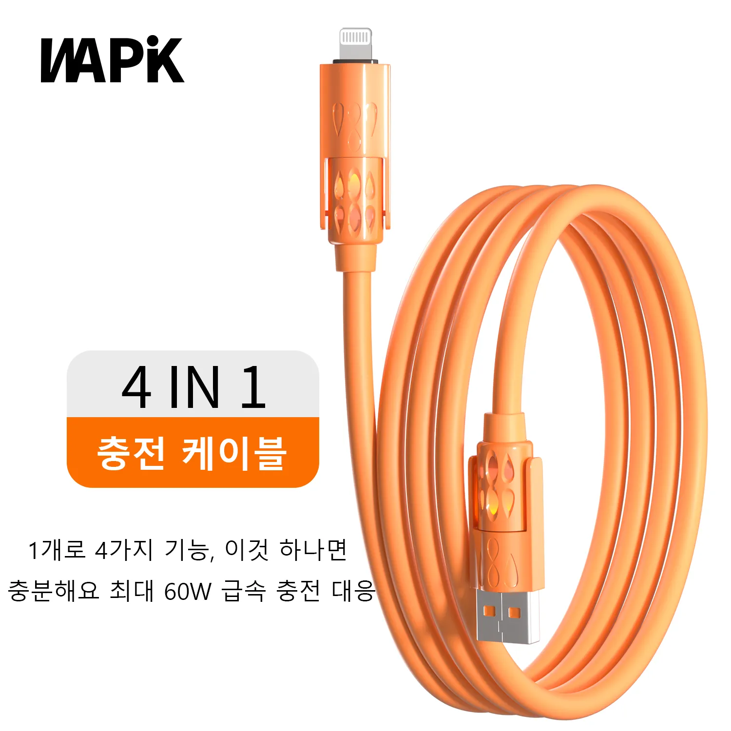 와픽 4-in-1 향기 고속 충전 케이블은 USB-A, USB Type-C, Lightning 등 다양한 인터페이스를 통합하여 스마트폰, 태블릿, PC와 호환됩니다. 고성능 칩이 내장되어 60W 고속 충전과 480Mbps 고속 데이터 전송을 지원하여 충전과 작업을 동시에 할 수 있습니다. 유연한 실리콘 소재로 제작되었으며, 상쾌한 향기가 나고 충전 중에는 은은한 불빛이 나옵니다. 3만 회 굽힘 테스트를 거쳐 내구성을 검증받았습니다.